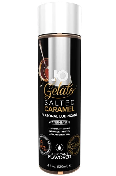 System JO Gelato Personal Lubricant Water Based Salted Caramel. Gelato is a flavored water based personal lubricant designed to enhance foreplay and comfort of intimacy. Formulated using a pure place sourced glycerin, this product provides a comfortable glide using quality ingredients. Each flavor profile is created around a base that is sugar, paraben and propylene glycol free for a gentle glide that is never sticky or tacky and has no after taste. Sugar free, safe for vaginal use. A must have for romantic getaways and anniversaries. Made in the USA