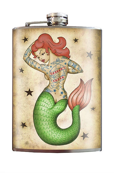 Here’s the “Tattooed Mermaid”. She’s beautiful and a bit dangerous; the ruin of many a sailor. Another of Milo’s original drawings. The tattoo on her back says “Sailors Grave”, a classic old school sailor tattoo. Drink with style…