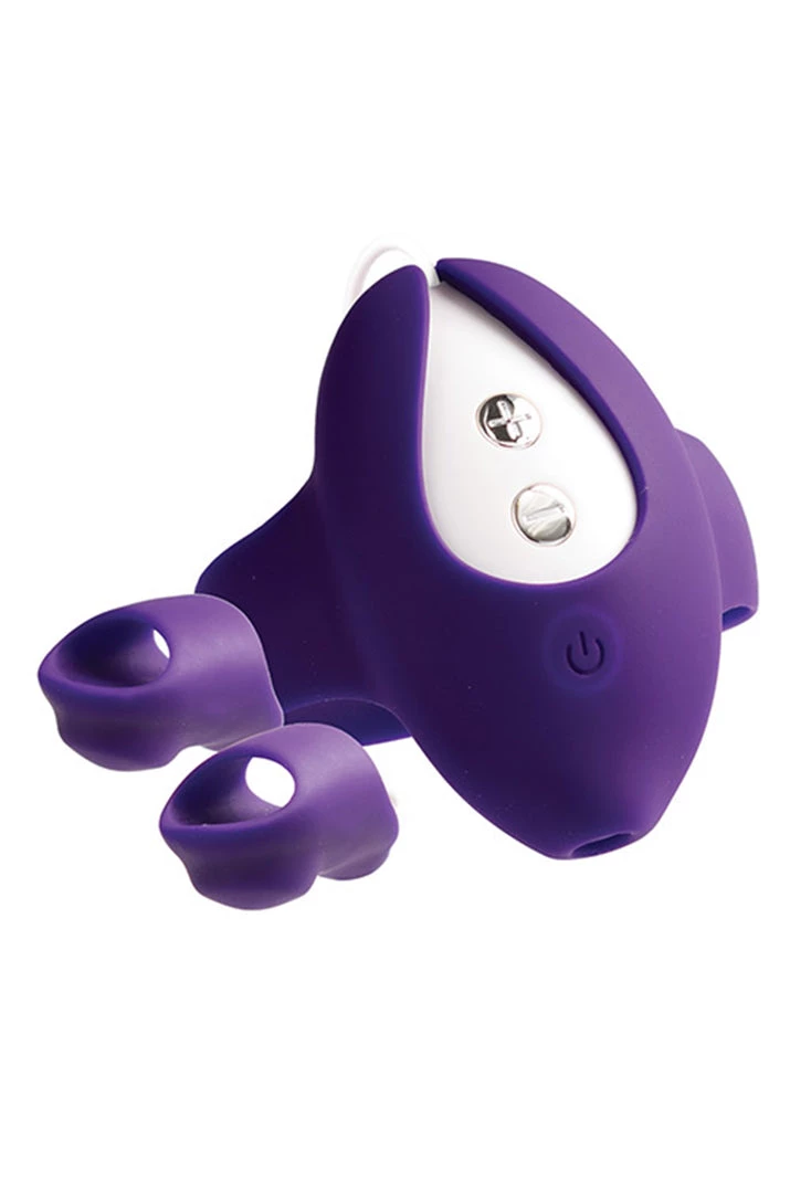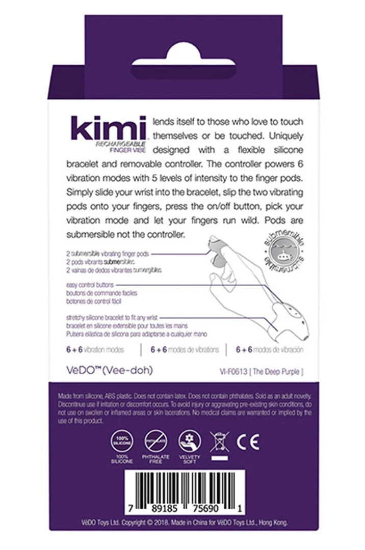 Vedo Kimi Rechargeable Dual Finger Vibe with Remote Control Purple designed for those who love to touch themselves or to be touched. Kimi rechargeable finger vibe lends itself to those who love to touch themselves or be touched. Uniquely designed with a flexible silicone bracelet and removable controller. The controller powers 6 vibration modes with 5 levels of intensity to the finger pods. Simply slide your wrist into the bracelet, slip the two vibrating pods onto your fingers, press the on/off button, pick your vibration mode and let your fingers run wild. Pods are submersible not the controller. Features: rechargeable, USB cable included. 6 + 6 vibration modes, extremely quiet. Velvety smooth silicone. Splash proof, submersible only finger pods. Running time 1 hour. Product size length 7cm, maximum diameter 5.5cm e or approximately 2.75 inches by 2.16 inches. Bracelet is a one size fits most.