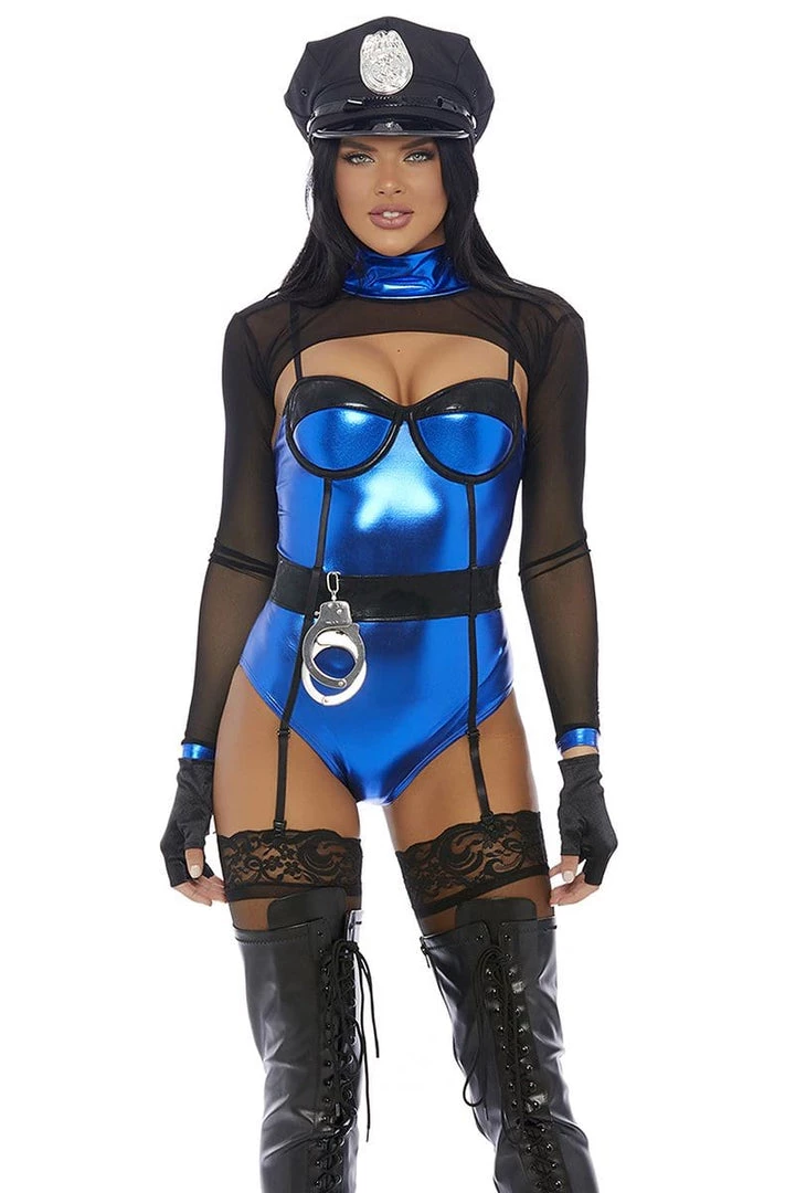You have the right to remain sexy this Halloween when you suit up in our 4 pc Mean Business Sexy Cop Costume. The bustier-style bodysuit features sultry garter straps and matching sheer mock neck bolero with metallic contrast. Fingerless gloves and handcuffs included! Cop hat sold separately.