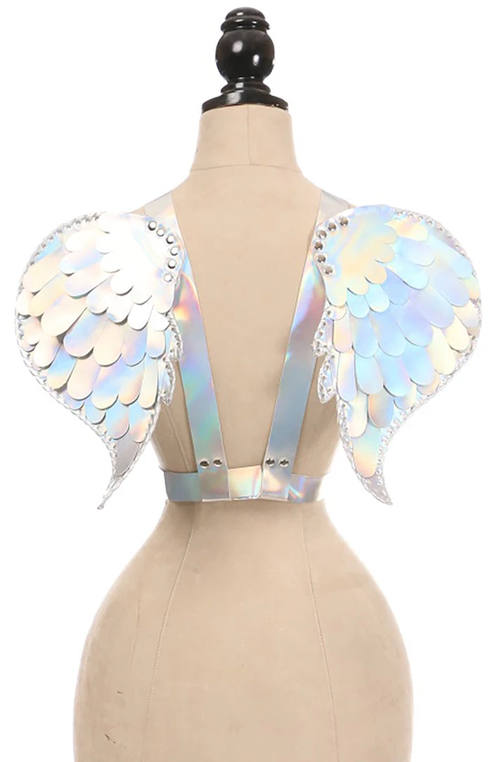 Holographic vegan leather angel wings with chrome hardware.  Adjustable in front