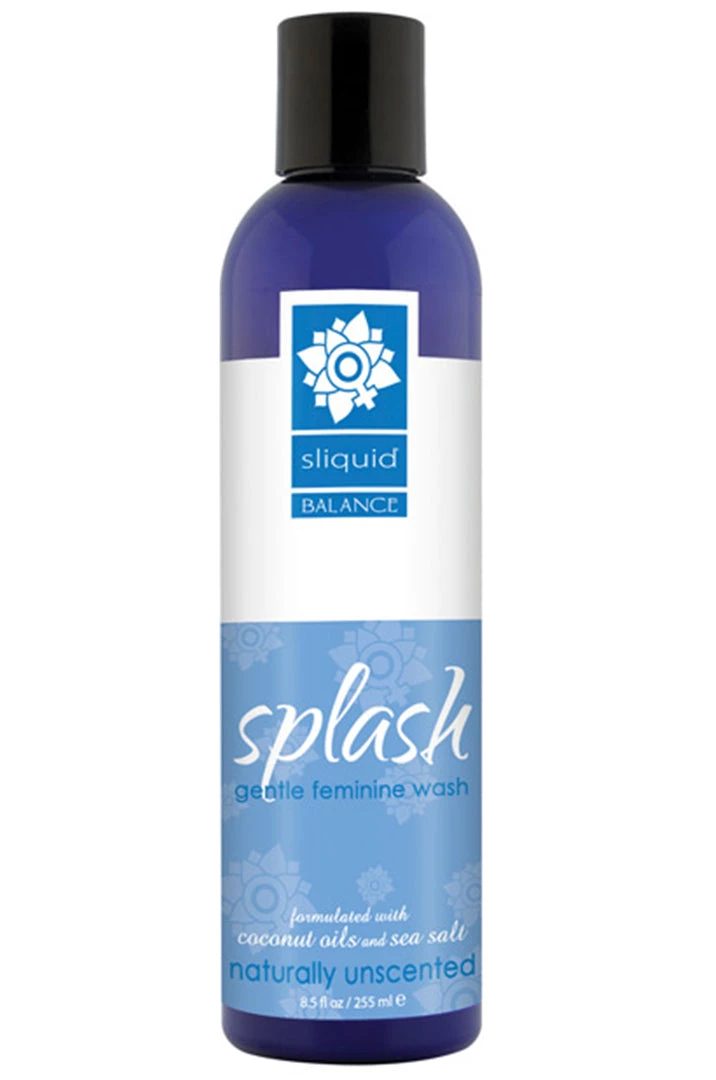 The Balance Collection. Sliquid Splash Unscented 8.5oz. Sliquid Splash is a gentle feminine wash, formulated as always completely glycerin and paraben free. There are four formulations of Sliquid Splash: Naturally Unscented, Honeydew Cucumber and Grapefruit Thyme. All are great alternatives to traditional soap and water and other harsh detergents. Fragrance formulas are blended with essential oils, coconut derivatives, and sea salt. Sliquid Splash is perfectly balanced to complement a woman’s pH. Sliquid Splash Ingredients: Purified H2O, Cocoamphoacetate, Coco Betaine, Coco Amide, Sea Salt, Citric Acid, Certified Organic Extracts of Aloe Vera, Hibiscus, Flax, Green Tea, and Sunflower Seed, Potassium Sorbate, Essential Oil Fragrances. Derived from coconut oil