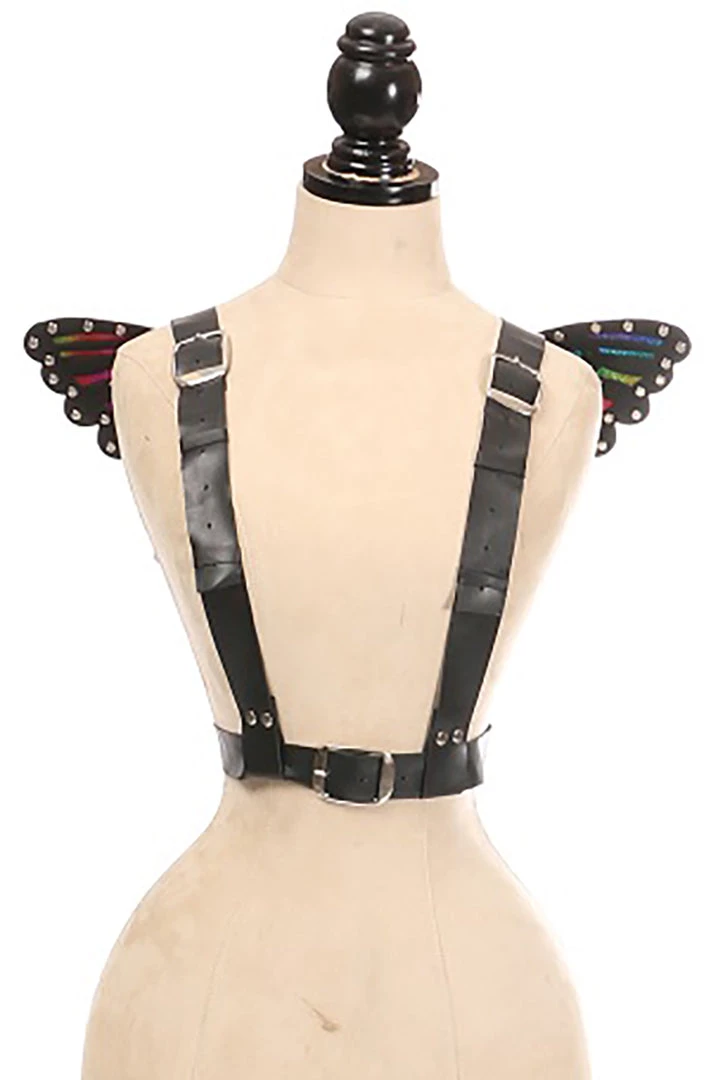 Black vegan leather and rainbow butterfly wings with chrome hardware.  Adjustable in front