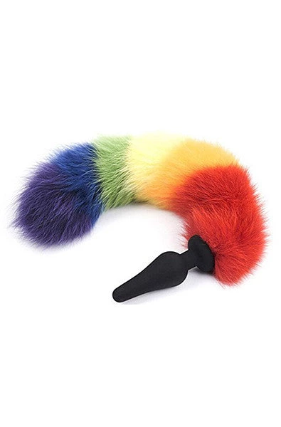 Take your sexual adventures to a fun and playful new place with a rainbow-colored tail plug! The narrow plug has a tapered tip and is made of smooth silicone for an easy insertion. The tail will sway back and forth with every movement of your hips! This sensual accessory is not compatible with silicone lube. Effectively clean and sterilize with mild soap and warm water after use. Measurements: 17 inches in total length. Plug measures 4.5 inches in length, 3.75 inches insertable, 1.5 inches in diameter at widest insertable point. Material: Silicone, fur.